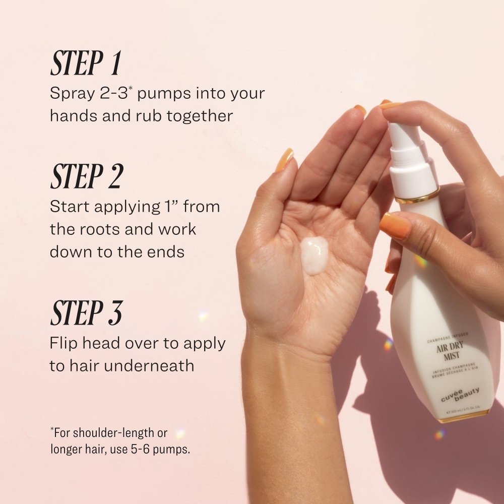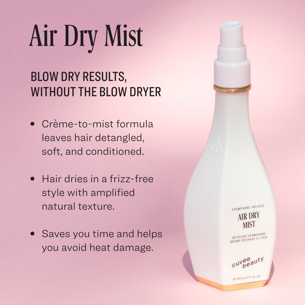 Effortless styling meets low-maintenance care with our champagne-infused Air Dry Mist. Perfect for giving your hair a break from blow dryers and heated tools, this innovative crème-to-mist formula hydrates and conditions while delivering lightweight, natural hold.