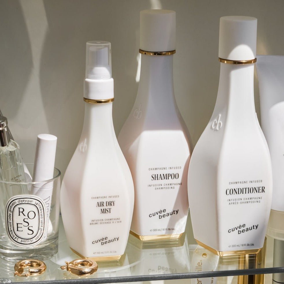 Meet the low-maintenance solution for luxe locks. Our best-sellers, bundled to bring out your best hair. Our champagne-infused Shampoo and Conditioner gently cleanse and condition hair without stripping essential oils or color, infusing extra strength and shine as the foundation for head-turning styles. Our best-selling Air Dry Mist adds low-maintenance, easy going hold for heatless style that hits, every tie. All infused with our signature Cuvée Complex with a proprietary blend of skincare-grade ingredients—it’s no wonder these are our most loved formulas.