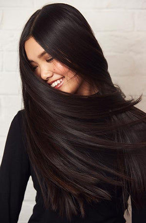 - Spray liberally starting 1’’ from roots to ends, ensuring you get those underneath layers, too.