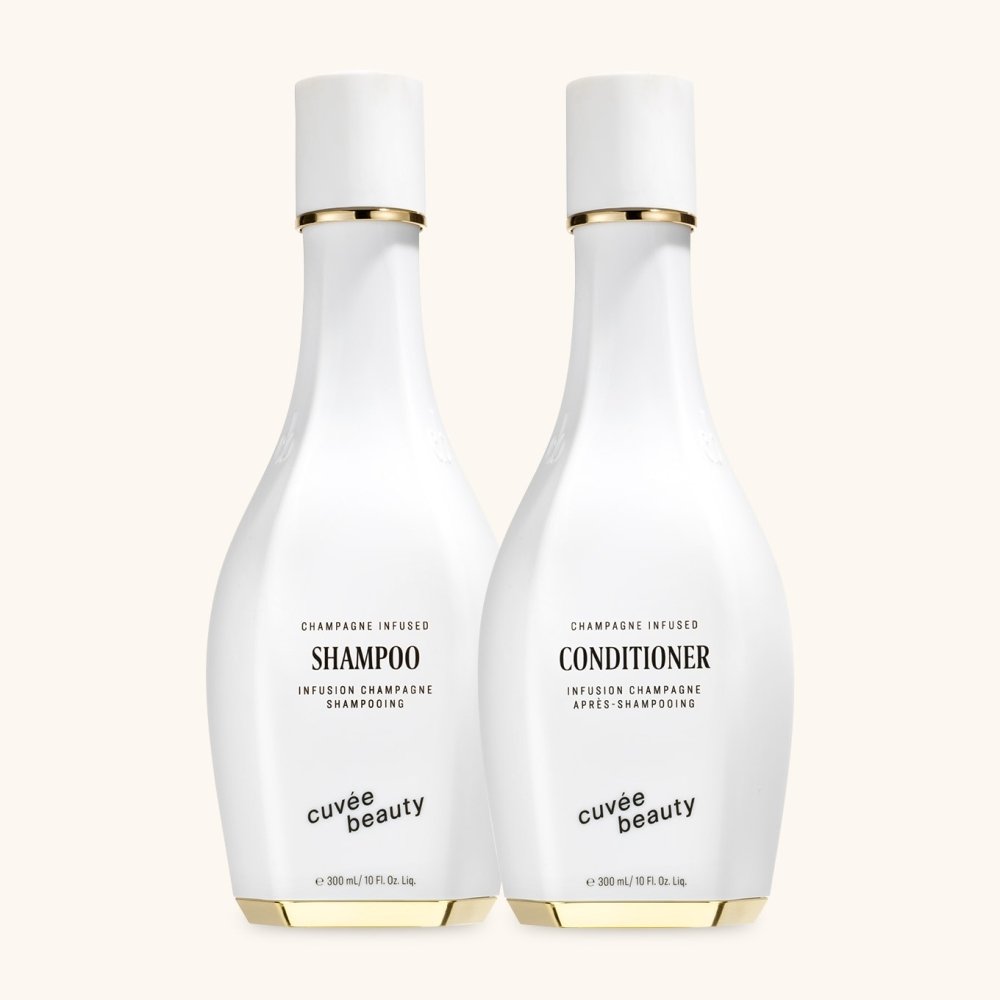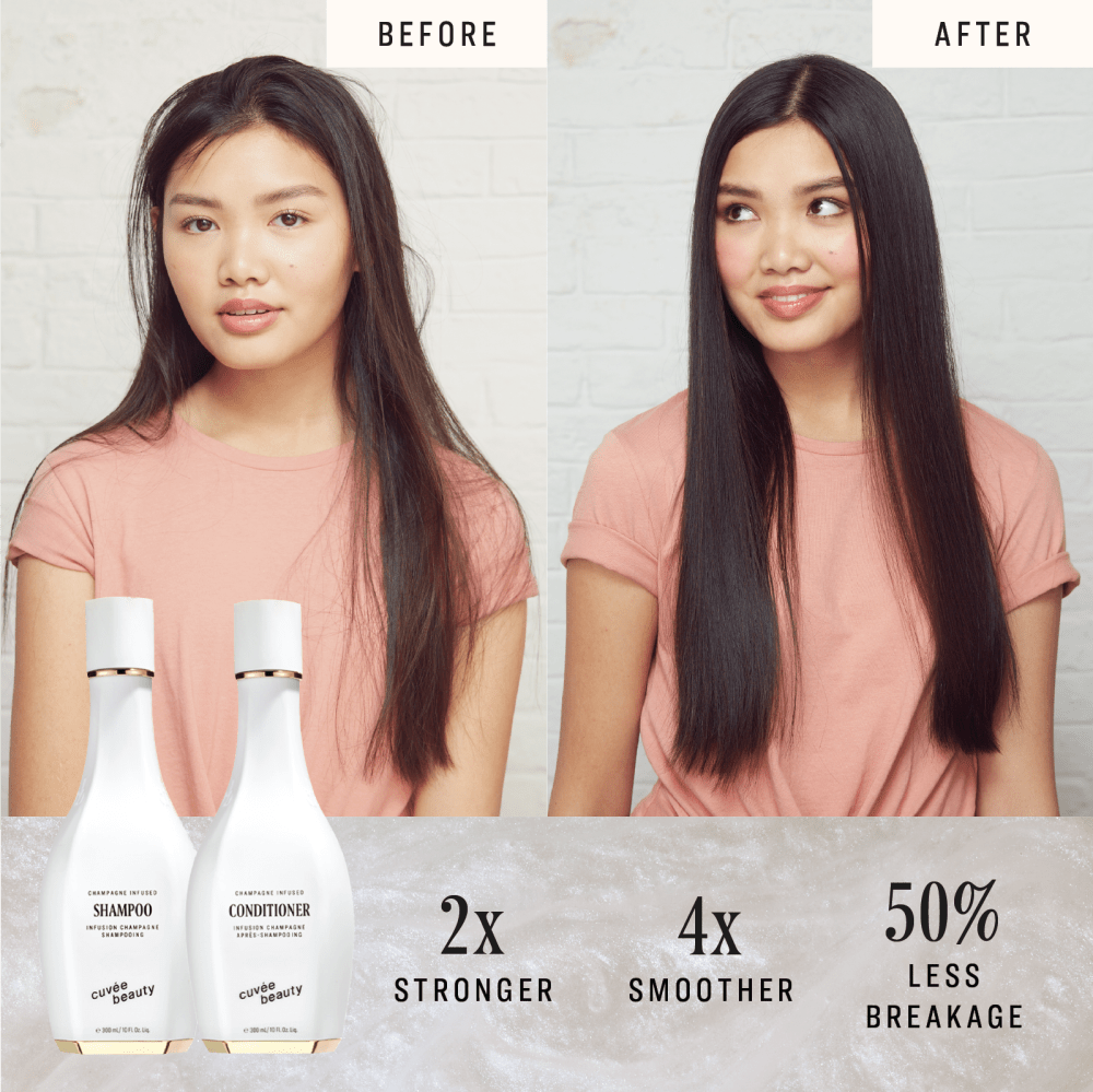 Expect healthy hair from root to tips. A healthy head of hair starts at the scalp. Think of our shampoo & conditioner like your cleanser & moisturizer. Gently wash hair without stripping essential oils or color then add weightless hydration for hair that looks healthy and shiny. When used as a system, our Shampoo and Conditioner clinically resulted in hair that is two times stronger, four times smoother and has 50% less breakage. All deliciously scented with Cuvée’s signature fragrance of champagne and fig leaf notes.